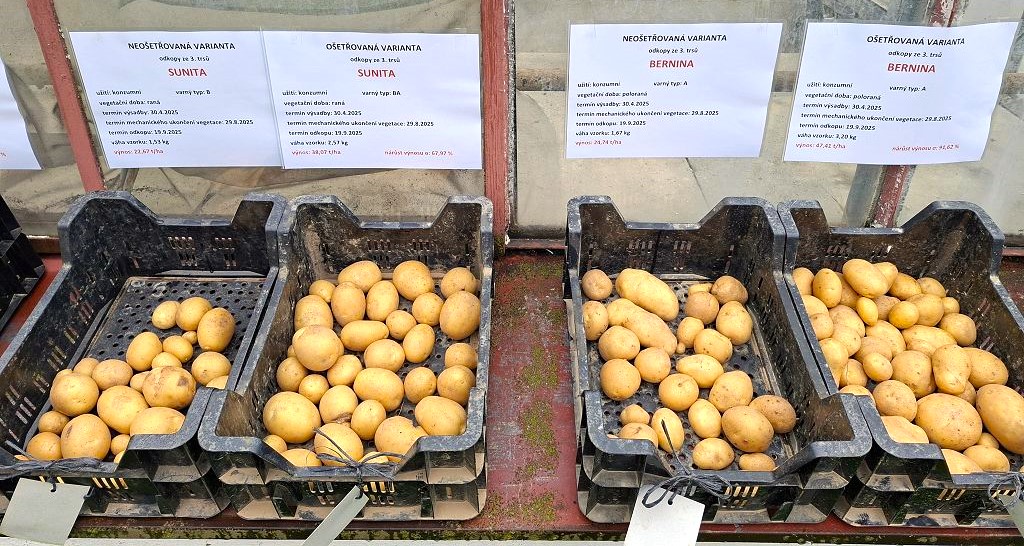 Během závěrečné ukázky odkopů hlíz vybraných odrůd (odrůdy nad 50 ha množení v roce 2025), byly účastníci seznámeni s vyhodnocením ošetřované a neošetřované varianty z hlediska výnosů a napadení hlíz plísní bramboru.