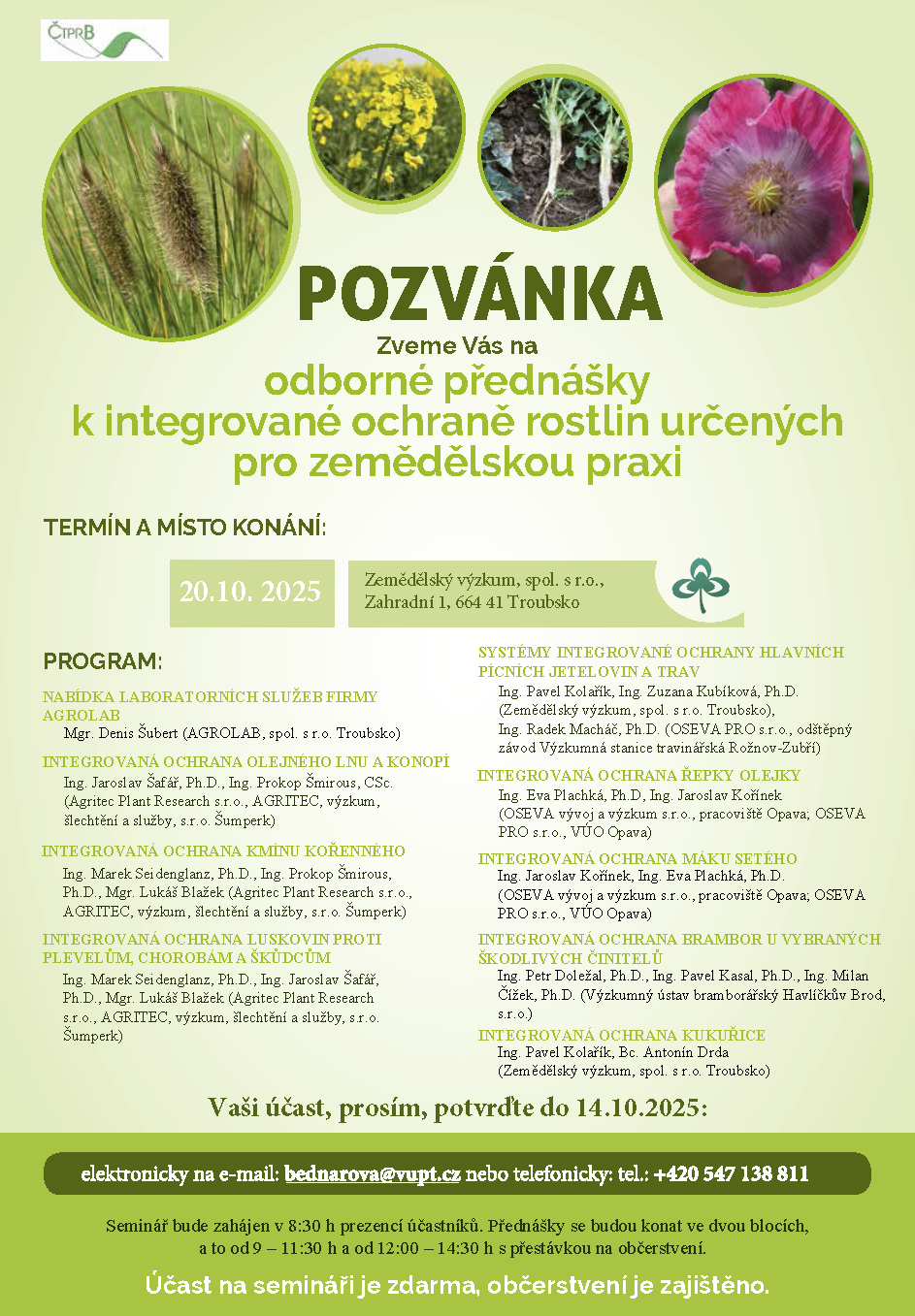Seminář je určený pro odbornou zemědělskou veřejnost. V rámci semináře vystoupí i pracovníci Výzkumného ústavu bramborářského s přednáškou na téma "INTEGROVANÁ OCHRANA BRAMBOR U VYBRANÝCH ŠKODLIVÝCH ČINITELŮ".