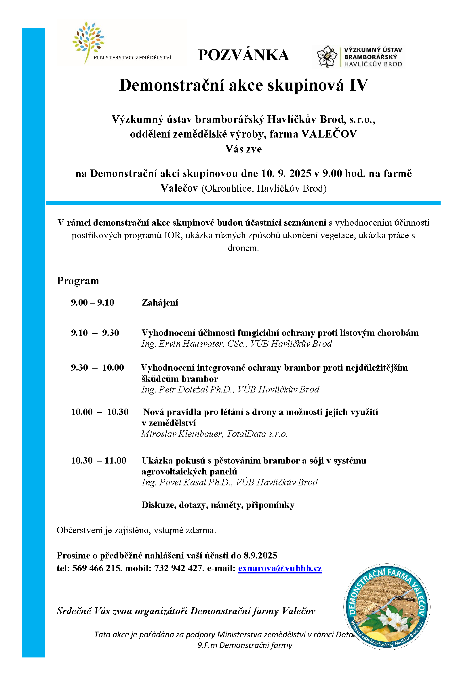 Výzkumný ústav bramborářský Havlíčkův Brod, s.r.o., oddělení zemědělské výroby, farma VALEČOV Vás zve na Demonstrační akci skupinovou IV dne 10.9.2025 v 9.00 hod. na farmě Valečov (Okrouhlice, Havlíčkův Brod).